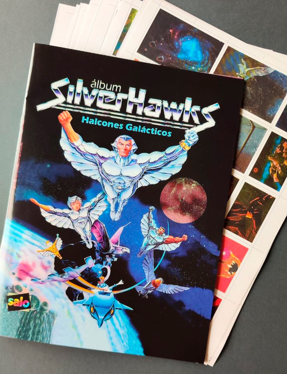 Álbum Silverhawks en una versión con láminas autoadhesivas para pegar. Réplica exacta del álbum original en tamaño e impresión. Hojas interiores impresas en papel bond 80 gramos y tapas, en bond 140 gramos. Escala original. Incluye el álbum vacío y todas sus láminas en pliegos de papel adhesivo para que recortes y pegues.